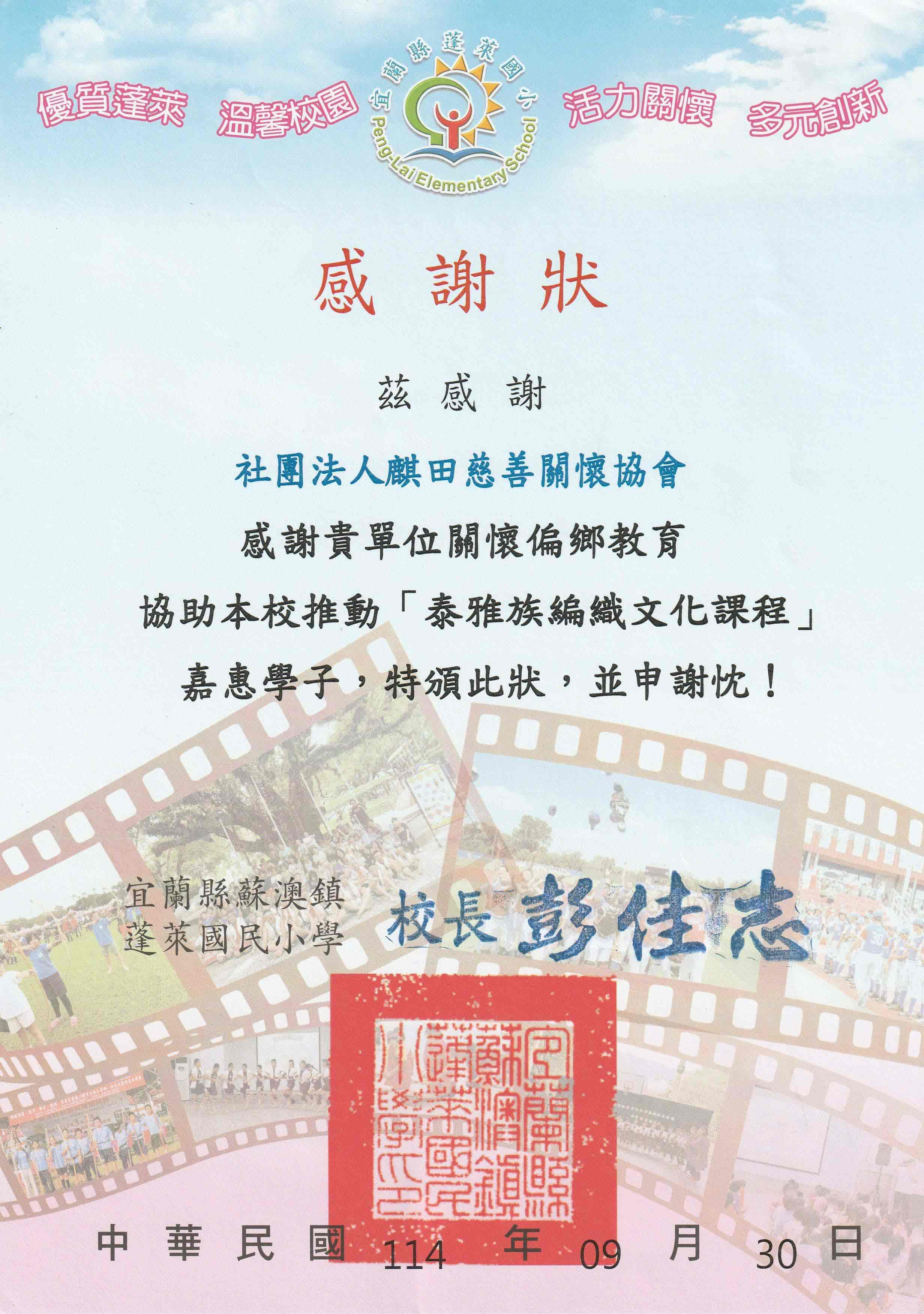 蓬萊國小感謝狀